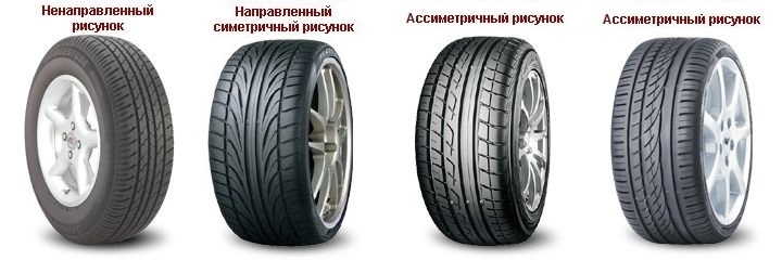 - Асимметричные шины — лучше других держат повороты за счет применения более жесткого типа резины в плечевой зоне в наружной части пятна контакта покрышки; также асимметричные покрышки являются самыми тихими, так как большая часть шума от покрышек уходит под машину при подобном рисунке протектора